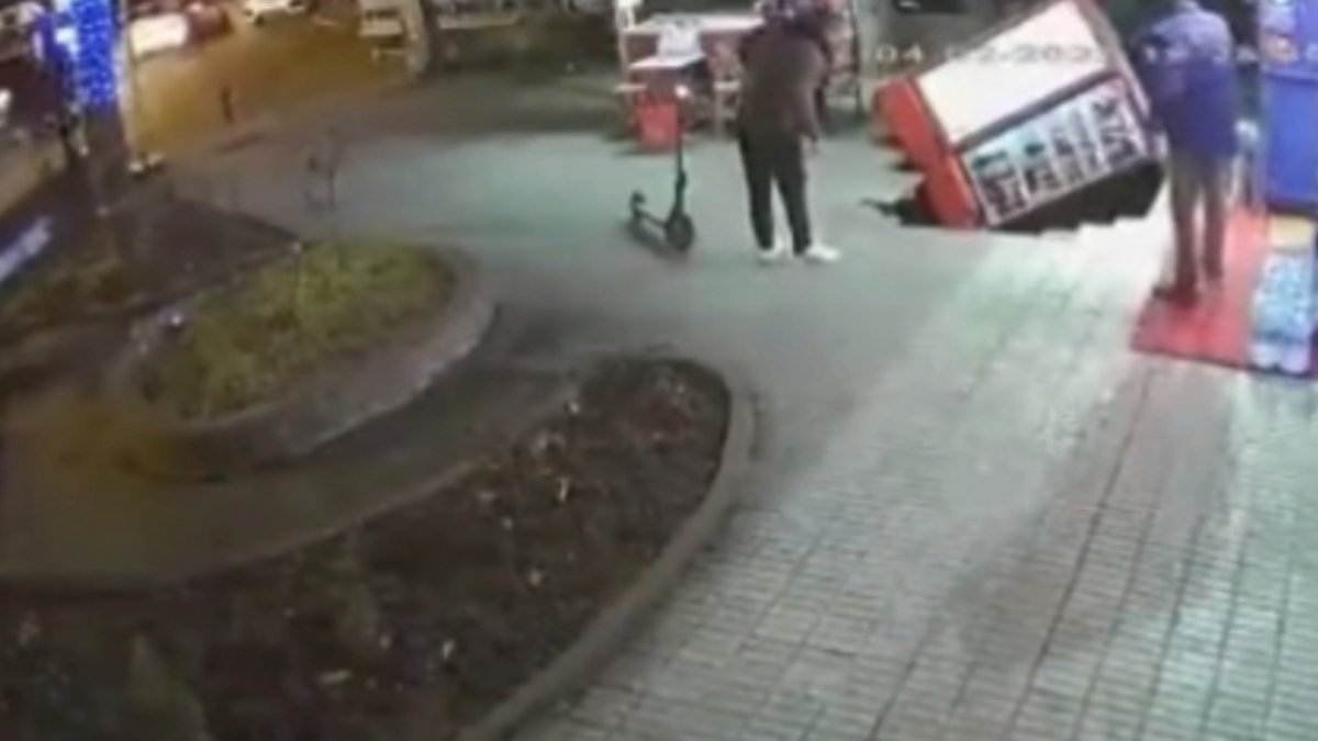 Telefonla konuşan iş yeri sahibinin, içecek dolaplarıyla birlikte çukura düşme anı bir işyerinin güvenlik kamerası tarafından saniye saniye görüntülendi.